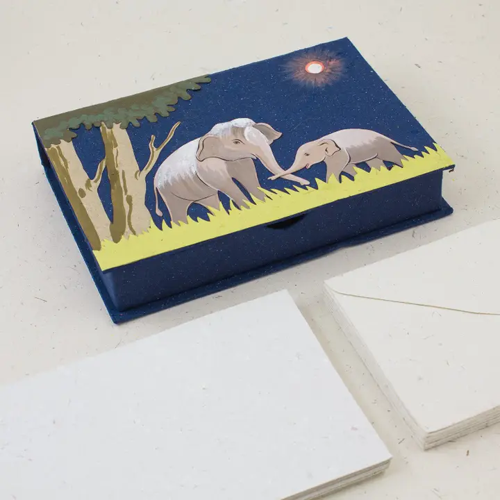 This boxed set stationery set is made from recycled material, including elephant dung. You will find 20 sheets of poo paper, and 10 envelopes in each set. The design on the front of the box will vary.